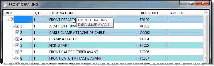 Several contextual commands are available form the bill of materials table. Some columns like the description or the comment can be modified, some others like the mass, le quantity or the material can not.