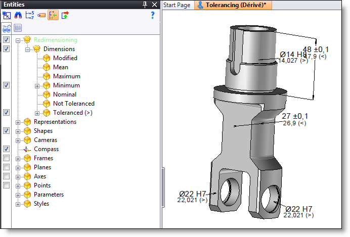 This command allows you to resize a derived part by applying different nominal, medium, minimum or maximum values of the toleranced dimensions of the original document.
