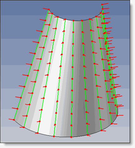 Quasi developpable surface (normal in red are not parallels between themselves along iso curves in green). |