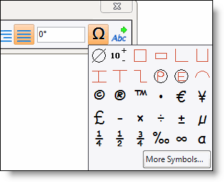 By clicking on More symbols, other symbols are available.(greek letters, monetaries, mathematics, for dimensions, for tolerances,...)