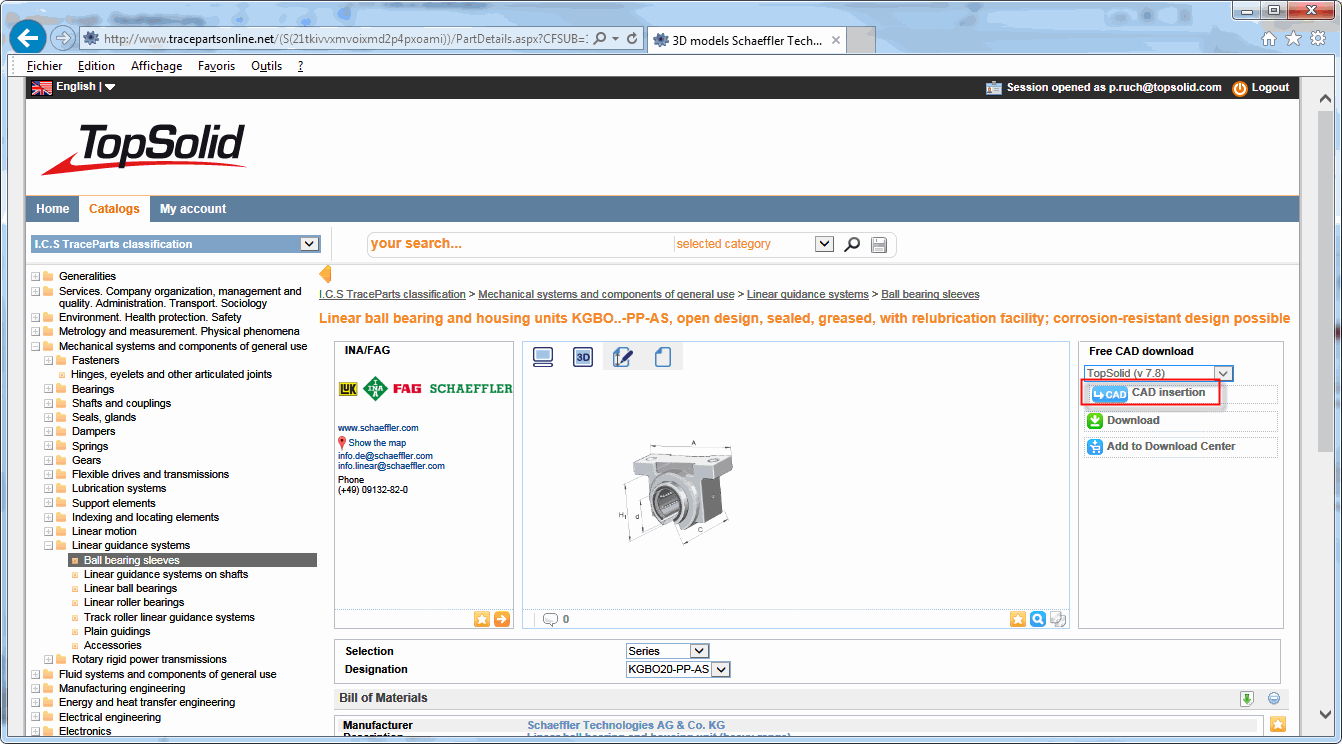 On the website, select a component then click on the CAD insertion button. If you aren't logged in, your login and password will be asked. |