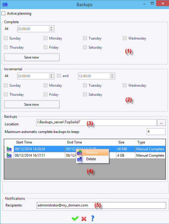 Enter the e-mail address of recipients for notifications (5). When a backup is finished or restored, a report is automatically sent by e-mail to these recipients. To be able to do that, the mail server must be configured in TopSolid.