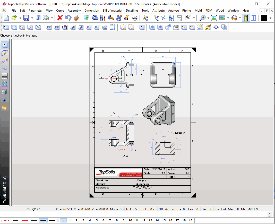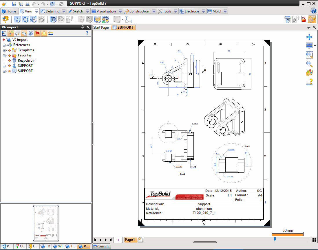 It is also possible to import the draft v6 by using the TopSolid'Pdf v6 interface. In this case, the imported file will be a pdf, which allows to have a perfect draft regarding the original to be able to print it. |