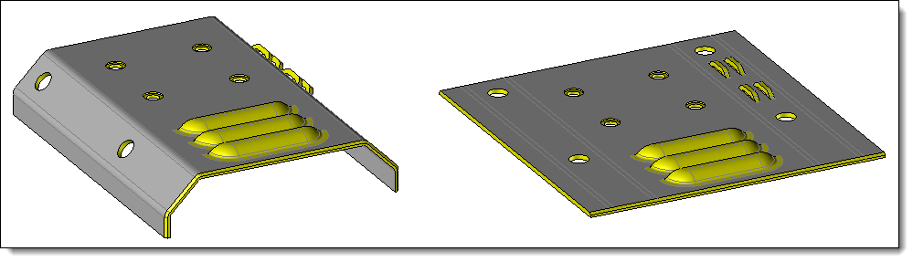The unfolding command allows to treat multi-bodies parts. These multi-bodies are created with the Bodies mode of the Removing command. Its Keep bodies option allows to separate a multi-bodies shape in several distinct shapes. It is the selected origin face which select the shape to treat. The origin face can be predefined in the part document by using the Unfolding positioning command. Generally, sheet metal to consider must be defined in the detailed and design representations of the part document. The inclusion in the unfolding document allows to select the representation and the shape to consider. However, from the PDM point of view, the fact to have a part document with several shapes in not relevant. The best way is to use the Tools > Derivations > Partial parts... command to isolate each shapes of the detailed representation in distinct documents. These part documents are automatically included in an assembly document. |