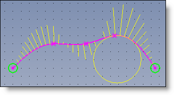 Handles (yellow spheres) at the ends of the curve allow tangencies to be defined through the popup menu when creating the curve. After activating the command, select the start or end tangent (line, axis, etc.). When the spline is validated, constraints between the tangent and referent element will automatically be created.