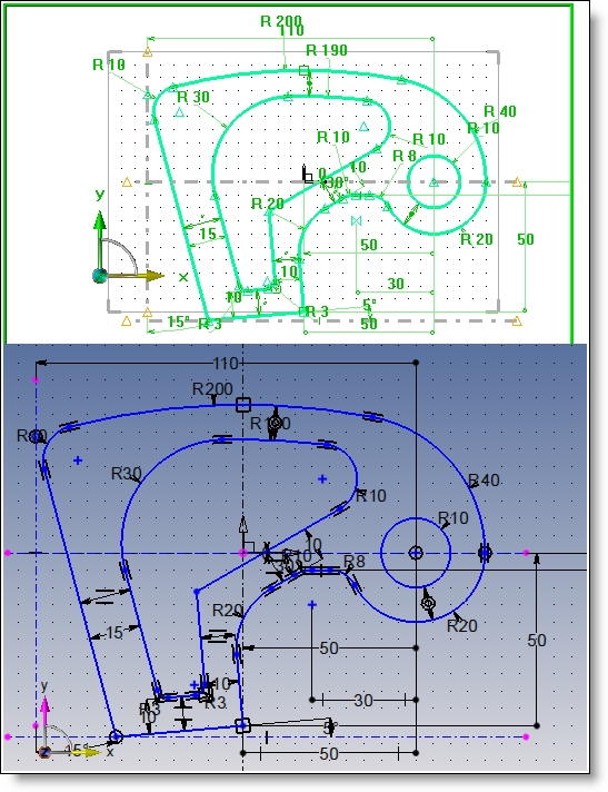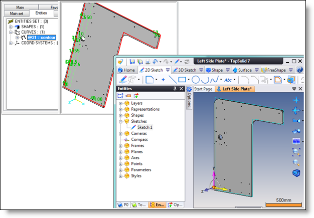 The TopSolid v6 sketches are translated to TopSolid 7 with certain dimensions and constraints. These dimensions and constraints must be defined into the sketch itself and not according to other external entities of the sketch.(For example, the parallelism constraint between a line of the sketch and an edge of the shape is not translated). All compatible dimensions and constraints are converted with their attributes and position.
