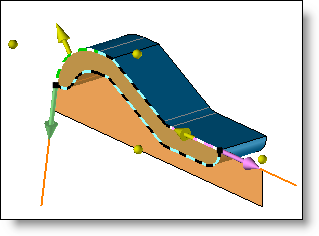 Exemple: Sur l'exemple ci-dessus, les arêtes vertes et mauves sont les arêtes de début et de fin. La flèche jaune sur l'arête mauve représente le sens de parcours du chemin de l'arête de début vers l'arête de fin. La flèche jaune sur l'arête verte indique le coté de la surface qui est limité. Les deux flèches mauve et verte indique la direction d'extension de début et de fin.