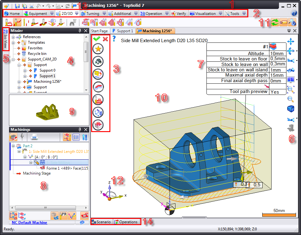Organisation sous forme de chronogramme. Permet de simuler les opérations d'usinage et d'afficher les opérations CN réalisées. L'onglet scénario montre les opérations en fonction de leurs durées.