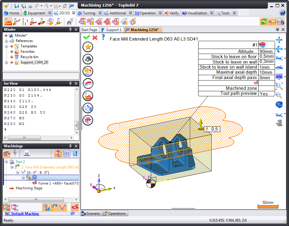 Grâce à la fenêtre "ISO" on peut visualiser le code ISO pour la ou les opérations d'usinage. Si la fenêtre du code ISO n'est pas disponible, il est possible de demander à la visualiser (voir la rubrique Gestion des fenêtres par un clic droit sur le bandeau de la fenêtre projet).