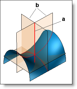 S'il est relativement simple de définir le rayon de courbure d'une courbe plane, pour une surface les choses se compliquent. On définit alors un analogue comme suit : en un point, on définit un axe, le vecteur normal à la surface (a). On imagine ensuite un plan tournant sur cet axe. Ce plan intersecte la surface considérée en une courbe. Il permet donc de définir une infinité de rayons de courbure. Parmi ces rayons, on choisit les rayons de courbure minimum et maximum. Ils définissent des courbures maximale et minimale. On les appelle les courbures principales, et les plans contenant ces courbures sont représentés ci-dessous (b). Les courbures principales sont donc les courbures, au point considéré, des deux courbes rouges intersections de ces plans et de la surface. La courbure moyenne est définie comme la moyenne de ces deux courbures. La courbure de Gauss est définie par le produit de ces deux courbures. |