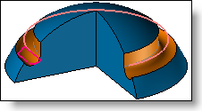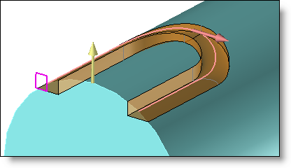 When the path is not planar but spatial, it is necessary to specify a direction that define the orientation of the tool along the path. The tool's orientation then remains fixed relative to the given direction. This orientation can be defined by a direction or faces (normal to the face along the path). In the example below, the direction is indicated by the yellow arrow.