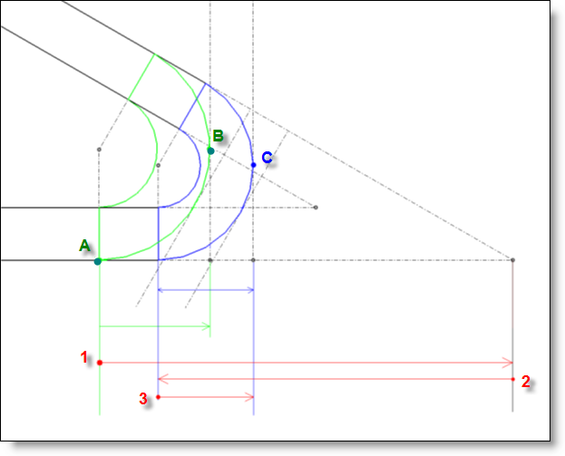 For bending angles < 90°, regarding the below scheme, it will be calculated following the [AC]points instead of the tangent dimension following the [AB] points which correspond to the design radius.
