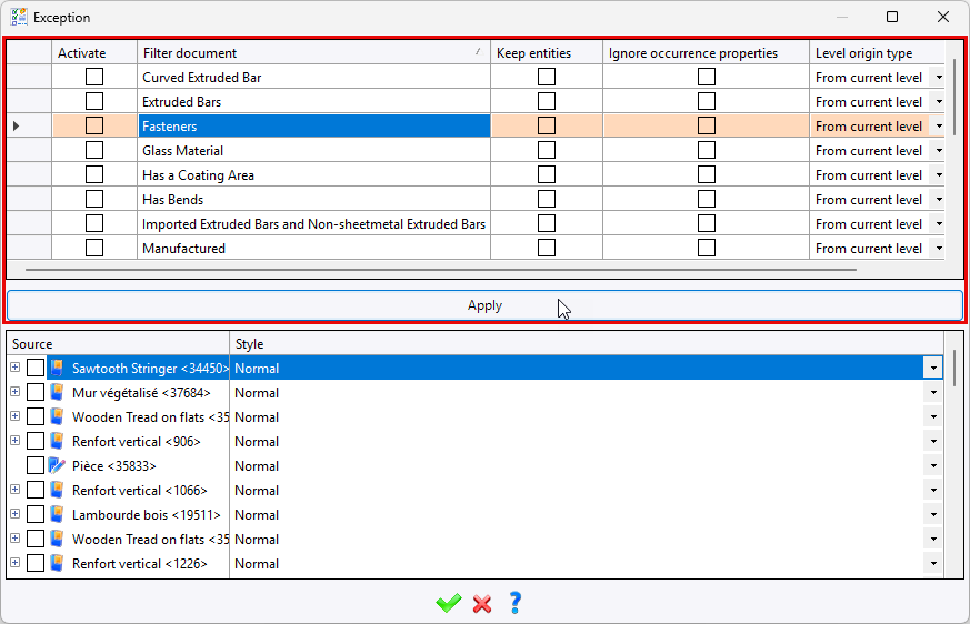 Activate: Allows you to enable or disable the filter document. Filter document: Allows you to filter the contents of the list. Keep entities: allows to define whether you want the filter to keep or ignore parts that match the filter criteria. Ignore occurrence properties: allows to ignore modifications made locally in the assembly to the properties of a part. Level origine type:
