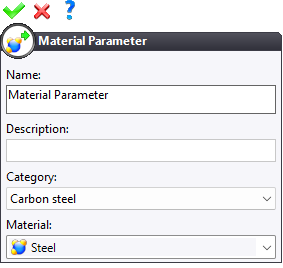 To validate the dialog, a material value must be assigned to this parameter. The chosen value itself is not important. (The material value of the part will be associated with this parameter to define the tool reference when exporting to the machining solution.)