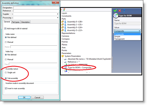 Translate attributes. Allows you to translate attributes (colors, layers, description) of imported parts. If the assembly attribute of TopSolid v6 is set to single unit, in this case, the type of bill of material system parameter will be single. If it is set as sub-assembly, it will be converted as composed.