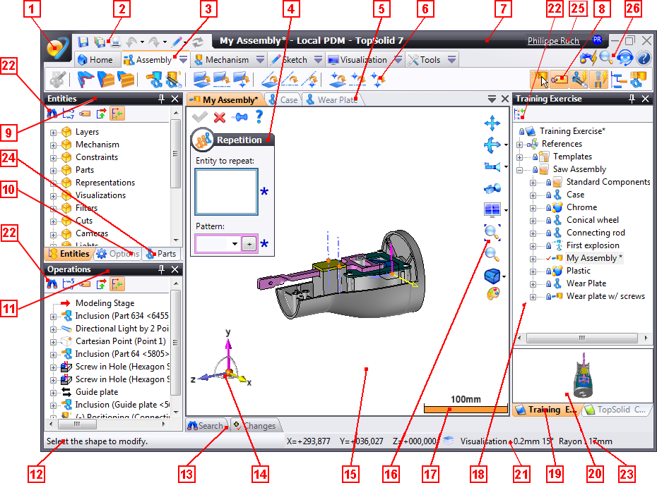 The TopSolid 7 screen consists of different zones allowing you to manage projects and documents: