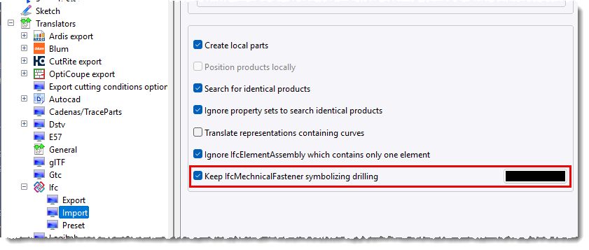 - In the section, the Keep IfcMechanicalFastener symbolizing drilling option now lets you import Tekla’s hole-representing cylinders with a specific color. This makes it easier to identify and use these elements during construction.